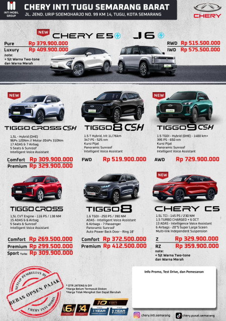 🚘 Dealer Resmi Chery Inti Tugu Depok Barat kini menghadirkan promo spesial untuk berbagai model Chery terbaru dengan harga terbaik dan bebas opsep pajak. ✨ Pilihan Mobil Chery Terbaru: Chery E5 Harga mulai Rp 379,900,000 – Rp 409,900,000 Chery J6 (Aluminium Body, EV) Harga mulai | Depok